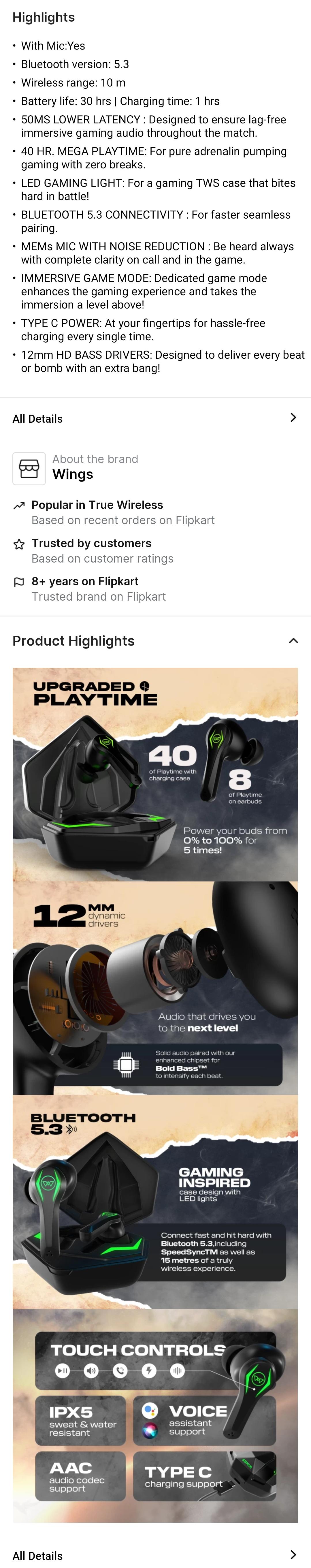 WINGS Phantom Pro earbuds with Low latency Game mode, 40H Playtime, 50ms low latency Bluetooth Headset (Black, True Wireless)